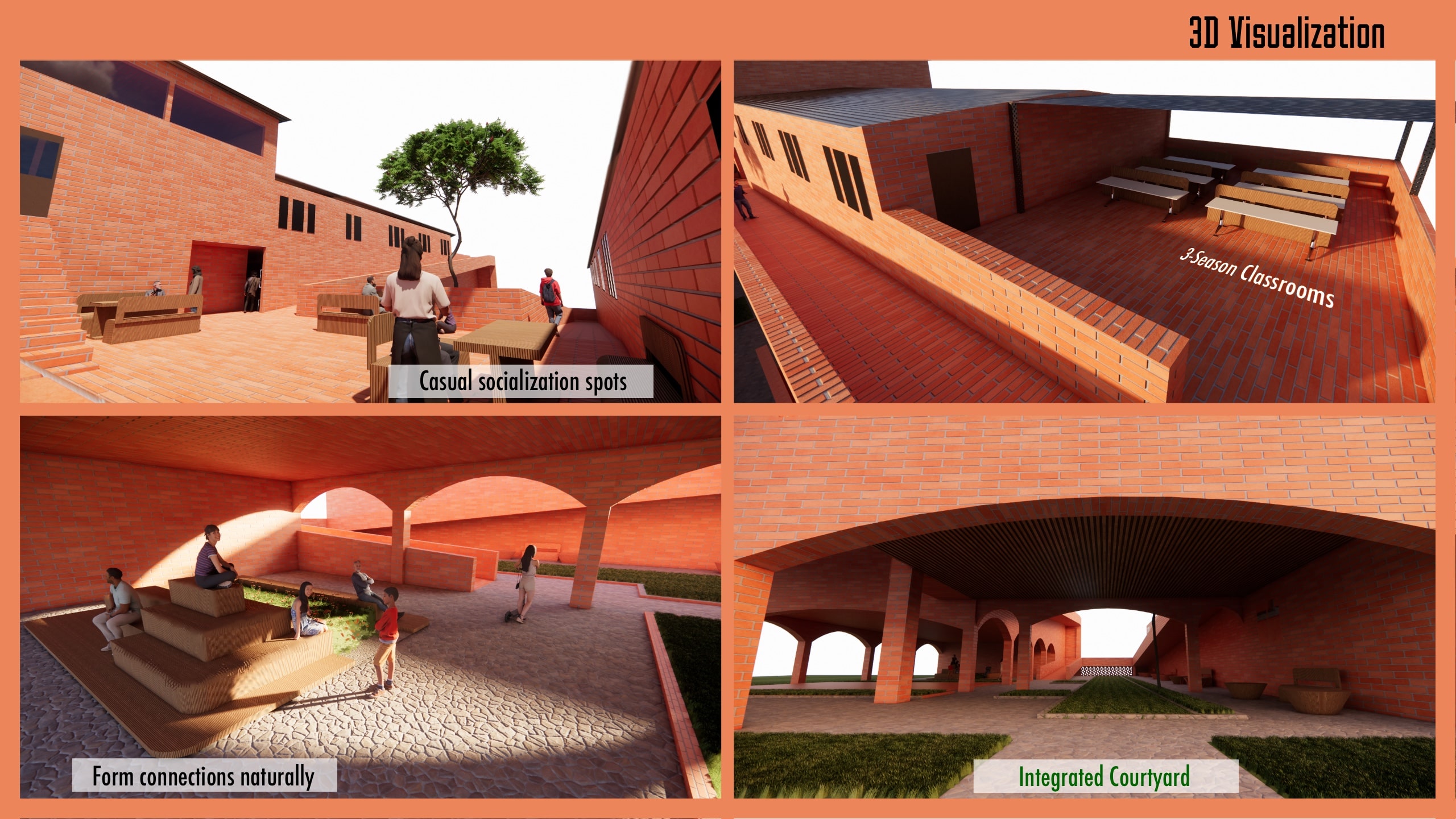 Light-filled corridors, terraces, and rooftop gardens connect homes with classrooms, labs, makerspaces, a theatre, art studios, and a library. The lower levels stay open and active for the neighborhood, while the upper floors provide secure, comfortable housing with generous outdoor space for every resident.