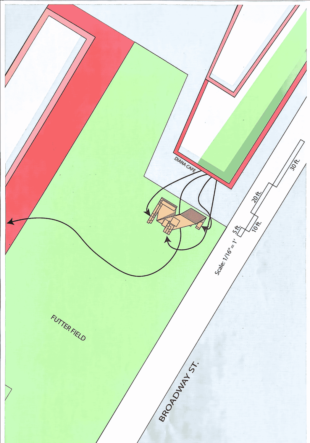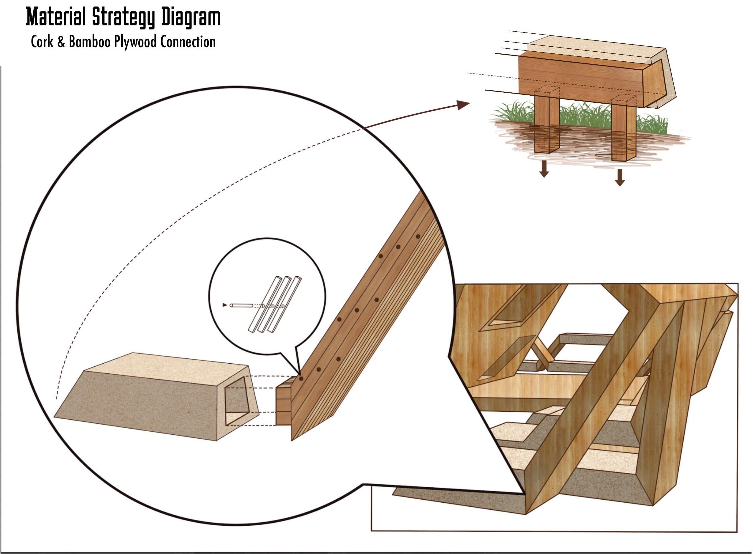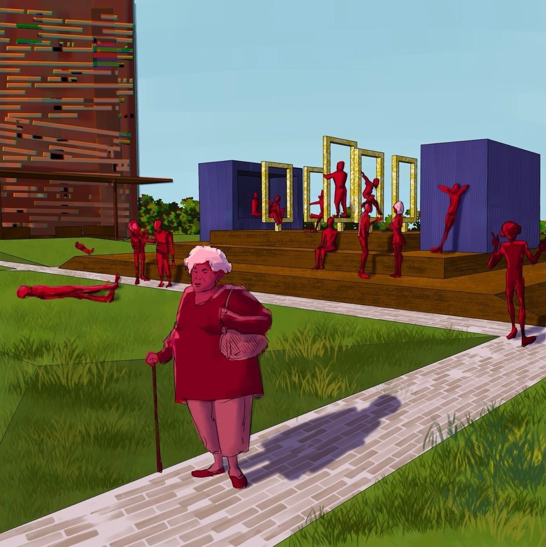 This piece reworks a portion of Futter Field with a stepped wooden platform, two simple volumes, and a line of oversized frames. The frames can be sat on, leaned against, or passed through, so the structure reads almost like a small stage that people can occupy in different ways. Gentle terracing in the surrounding grass shapes loose “rooms” around it, giving the open lawn a clearer place to pause, meet friends, or watch what’s happening.